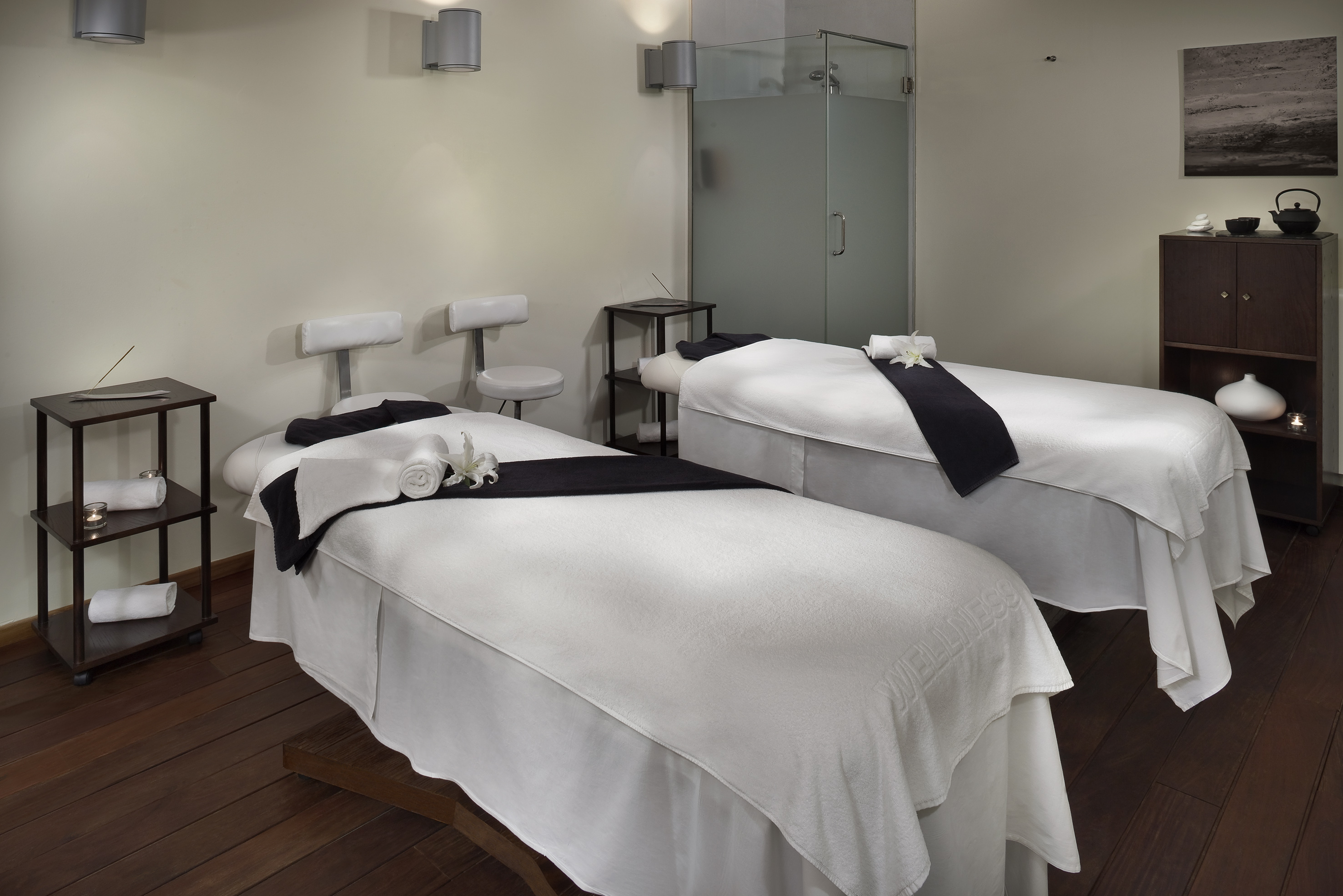 Piscina dinámica con jets de presión a diferentes alturas, bancos oxigenantes y tumbonas de hidromasaje, cascadas y cuellos de cisnes para zona cervical, nado contra corriente, pediluvio, sauna finlandesa, baño turco, hidromasajes y duchas de sensaciones. Servicio con cargo adicional.